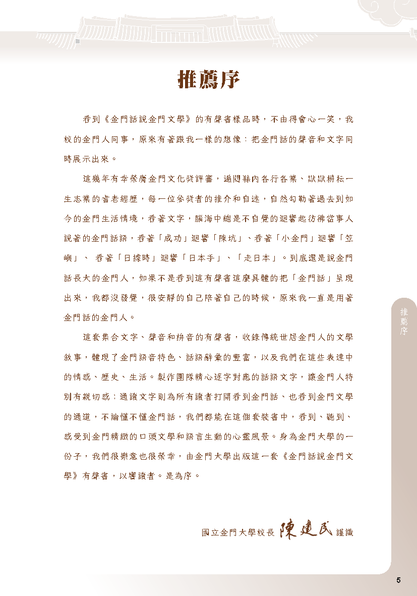 本校獲文化部補助製作「金門話說金門文學有聲書」已經出版,有聲影像線上連結公開瀏覽,歡迎各界推廣利用。